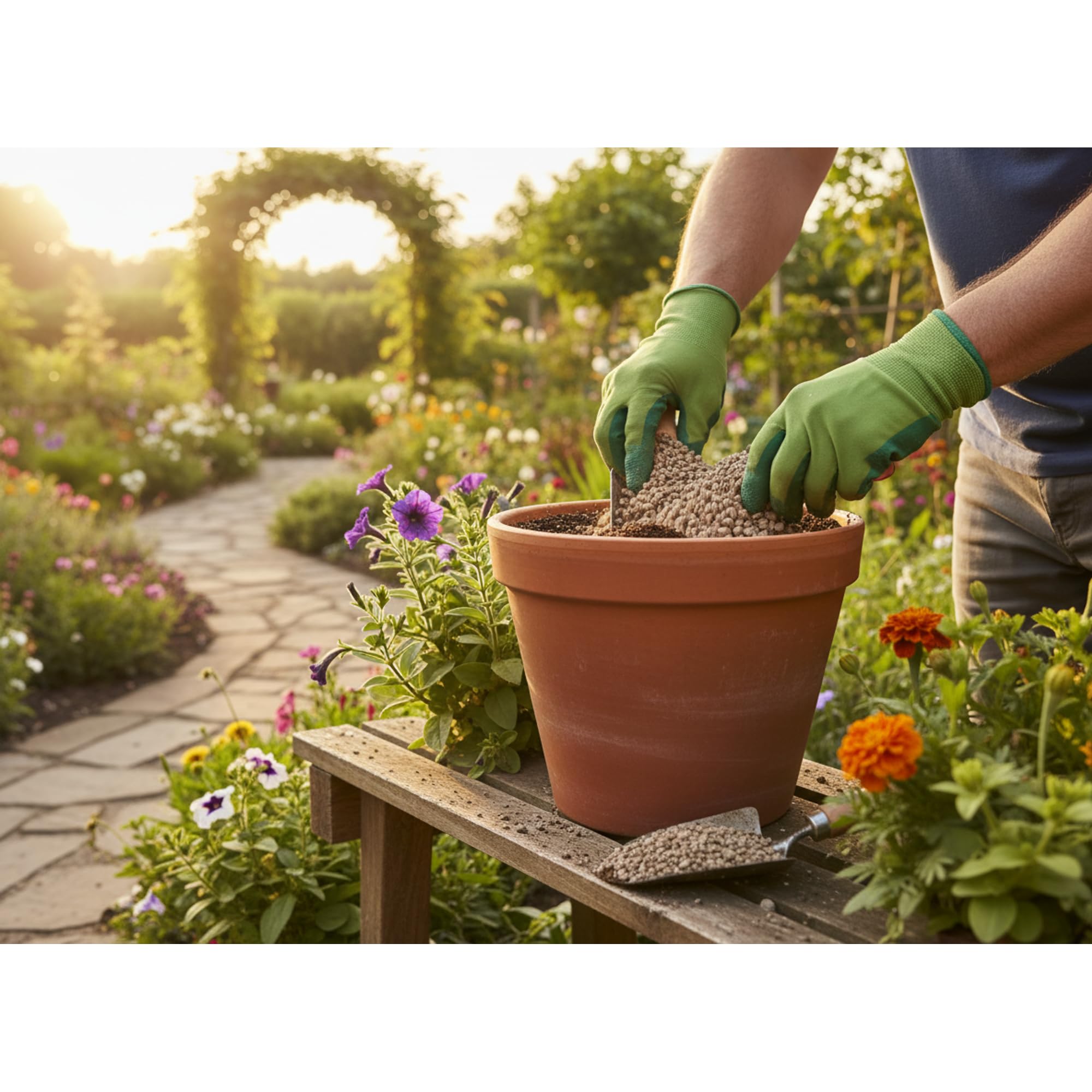 Mischen Sie das Granulat in einem Verhältnis von etwa 1:3 mit normaler Blumenerde, um eine luftige und dennoch wasserspeichernde Mischung zu erhalten. Für Kakteen oder andere Sukkulenten kann der Anteil an Bims noch höher liegen. Dieses Substrat lässt sich unkompliziert auf Terrassen oder zur Gestaltung kleiner Steingärten einsetzen.