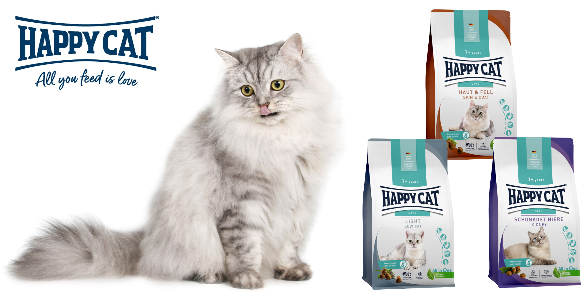 Das Happy Cat Care Sortiment wurde für sensible Katzen mit speziellen Bedürfnissen entwickelt. Denn der Organismus einer Katze kann im Laufe ihres Lebens aus dem Gleichgewicht gebracht werden. Mit Hilfe der Happy Cat Care Produkte können diese Aspekte positiv beeinflusst werden - zum Beispiel bei haut- und verdauungssensiblen oder zu Übergewicht neigenden Katzen.