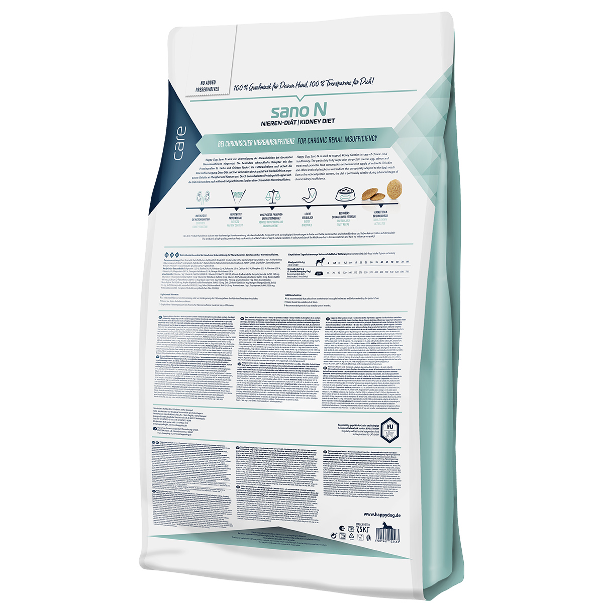 - Es wird empfohlen, vor der Verwendung von Happy Dog Sano N oder vor Verlängerung der Fütterungsdauer den Rat eines Tierarztes einzuholen und die Nierenfunktion weiterhin regelmäßig kontrollieren zu lassen.