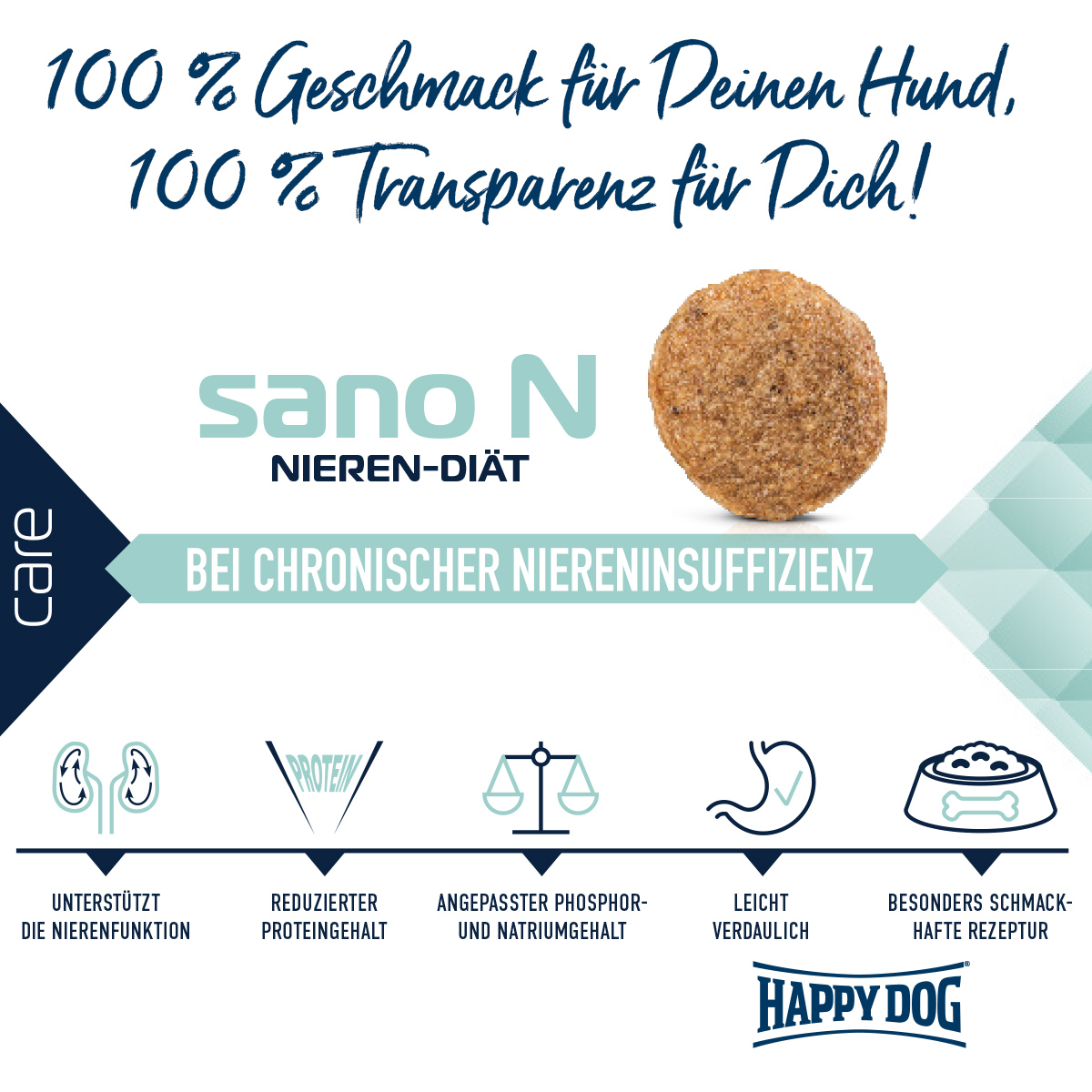 - Die empfohlene Fütterungsdauer von Happy Dog Sano N beträgt zunächst bis zu sechs Monate. Meist ist eine lebenslange Fütterung notwendig.
