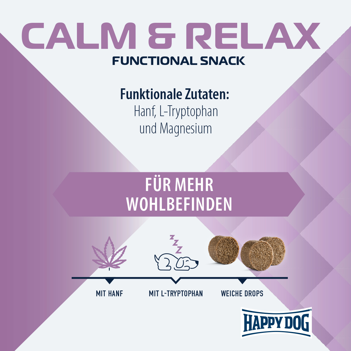 Manche Vierbeiner kann so leicht nichts aus der Ruhe bringen. Andere hingegen reagieren auf Veränderungen, besondere Situationen oder Ereignisse sensibel. Ist dein Hund schnell überfordert, dann ist unser Happy Dog Care Snack Calm & Relax optimal für ihn geeignet. Die getreidefreie Rezeptur der Hundeleckerlis mit wertvollem Hanf, L-Tryptophan und Magnesium sorgt für kleine Wohlfühlmomente in herausfordernden Situationen, wie z.B. bei Gewittern, an Silvester oder bei einem anstehenden Tierarztbesuch. Die weichen Drops dieses funktionellen Hundesnacks sind einfach in der Handhabung und perfekt zu dosieren. Hergestellt in Deutschland ohne den Zusatz von Zucker und ohne künstliche Aroma-, Farb- und Konservierungsstoffe.