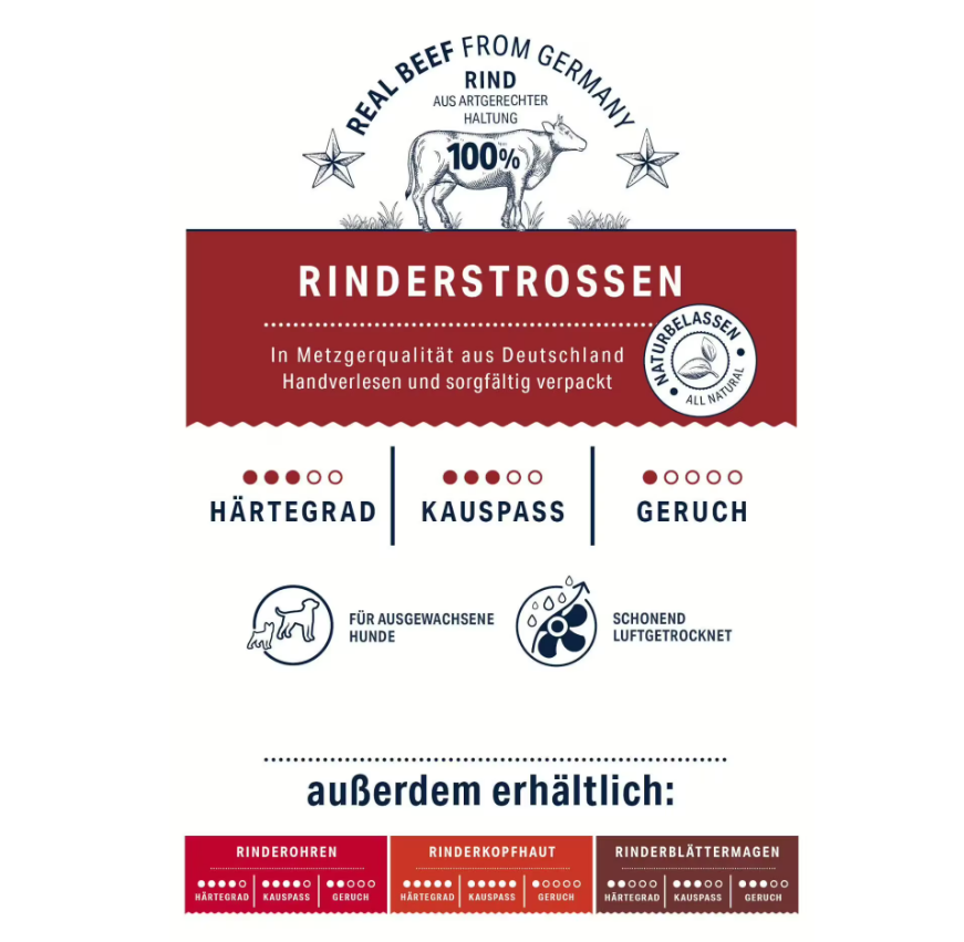 Zudem zeichnen sich Rinderstrossen durch einen hohen Protein- und Knorpelgehalt aus. Der Snack stammt von Rindern aus artgerechter Haltung, ist von Natur aus getreide- und zuckerfrei und wird ohne Konservierungsstoffe schonend getrocknet.
