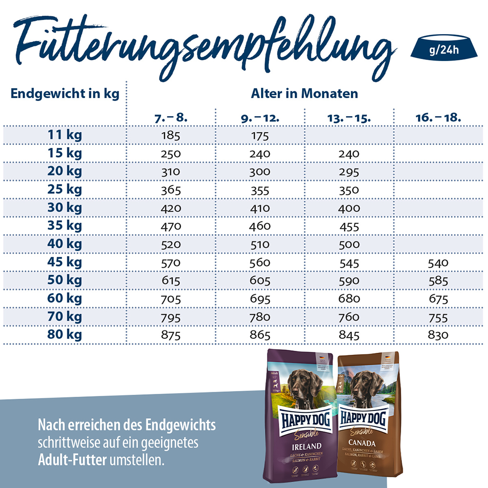 Ab dem 7. bis einschließlich zum 18. Lebensmonat empfehlen wir Sensible Junior Lachs & Kartoffel. Danach ist dein Welpe ausgewachsen: Erst dann wird es auch Zeit, auf sogenanntes Adult Hundefutter umzustellen. Passendes Anschlussfutter für deine Fellnase hält zum Beispiel unsere Happy Dog Sensible Linie bereit.