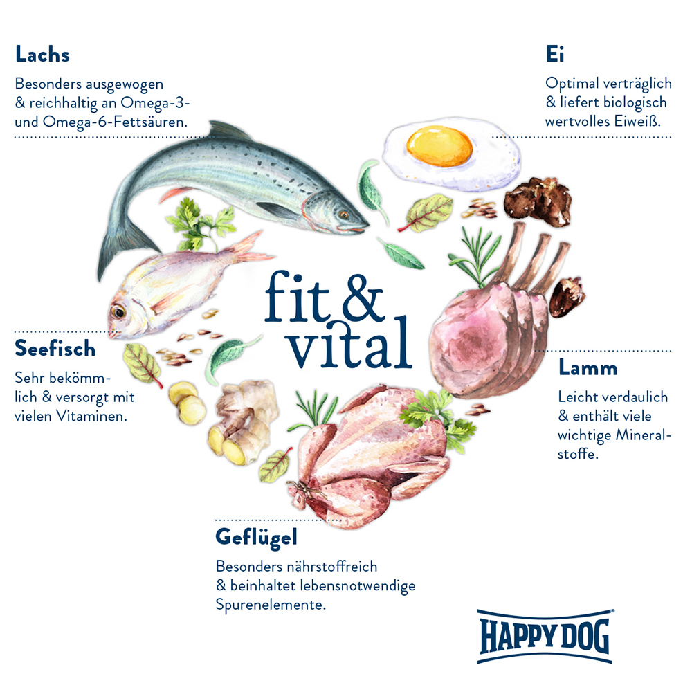 Damit der Stoffwechsel deines Hundes optimal und artgerecht unterstützt wird, greifen wir auf natürliche Inhaltsstoffe zurück, die mit besten Eigenschaften versehen sind. Unser Happy Dog Natural Life Concept kombiniert Zutaten, von denen der Organismus deines Hundes ganzheitlich profitiert: Spurenelemente, Leinsamen, ausgesuchte Kräuter, Apfel und grünlippige Neuseeland-Muschel