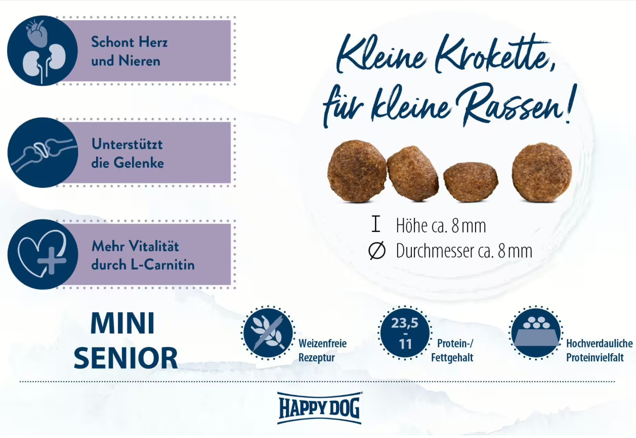 Vitalität für den 3. Lebensabschnitt von Rassen bis 10 kg. Mit zunehmendem Lebensalter stellt sich der Stoffwechsel unserer Hunde langsam um. Zur Schonung der inneren Organe müssen daher bei einer angepassten Senioren-Ernährung die Mengen an Proteinen, Natrium und Phosphor abgesenkt werden. Der Energiegehalt der Nahrung sollte jedoch nur geringfügig reduziert sein. Happy Dog Mini Senior wird mit 5 wertvollen Proteinquellen hergestellt und ist daher besonders ausgewogen.
